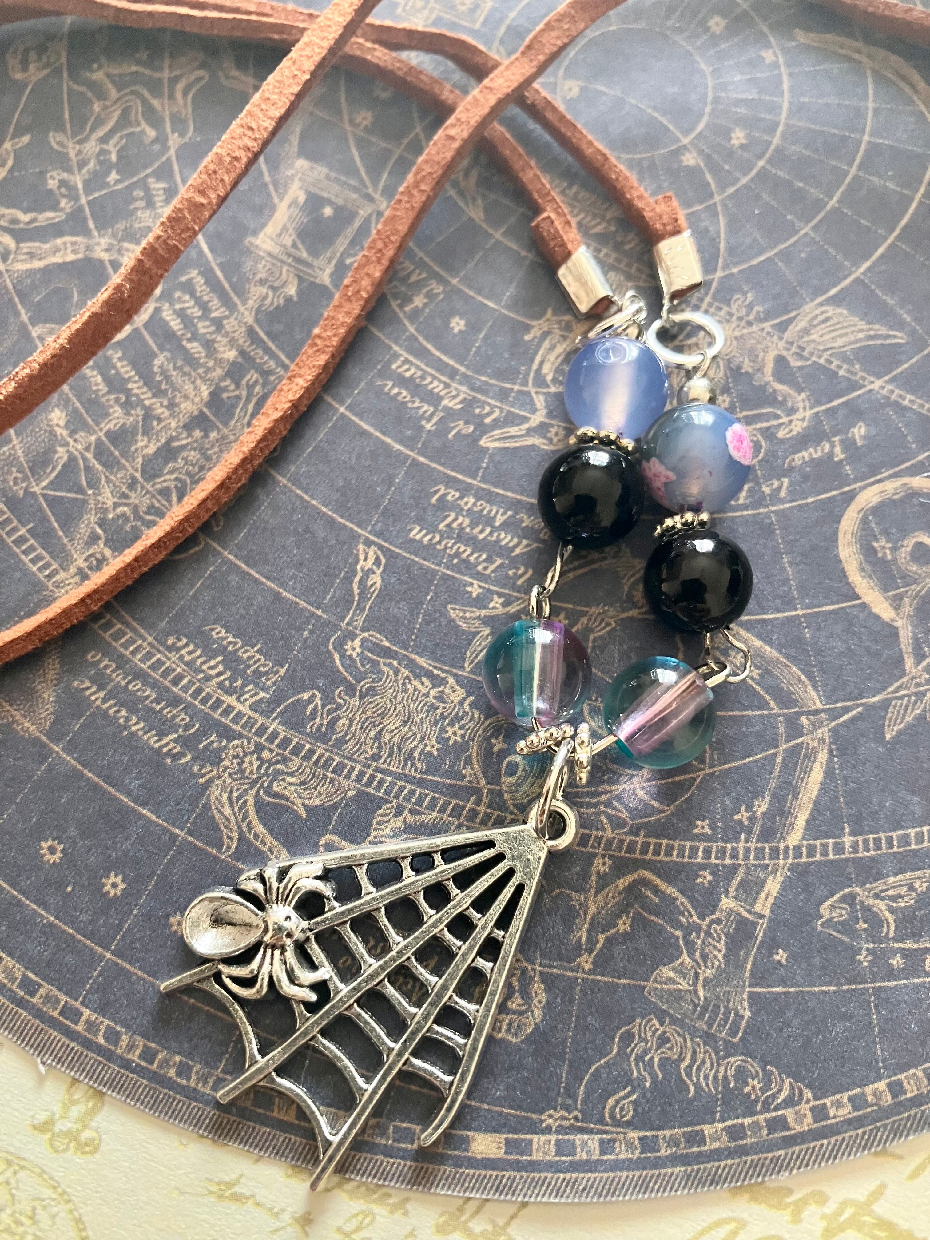 【N10】シルバー蜘蛛の巣スエード紐ペンダント