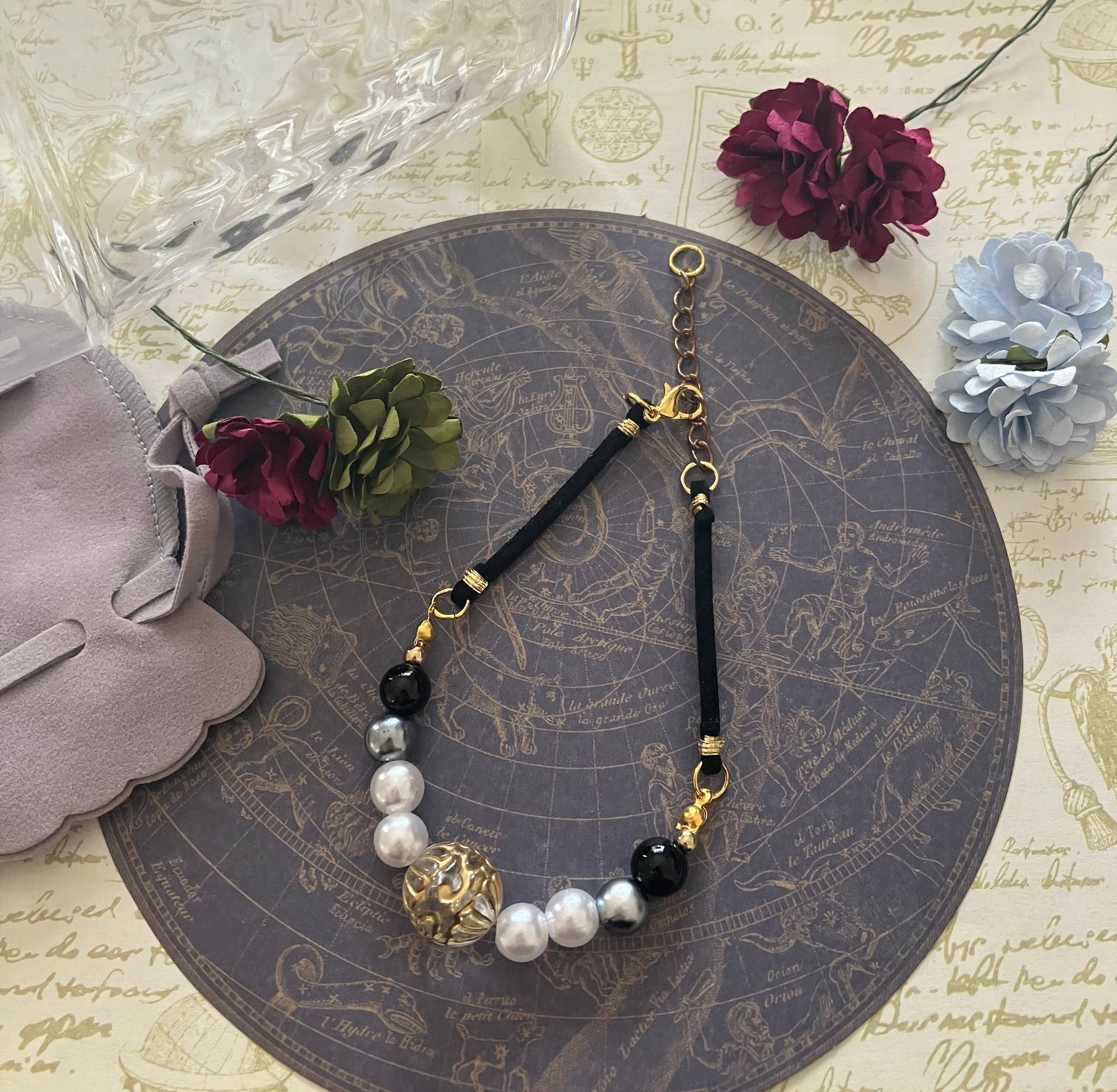 スエード紐のシンプルなデザインのブレスレットです。個性的なアクセントとして、アンティーク調の紐とブレスレットの組み合わせがシンプルでありながらもお洒落さを演出。