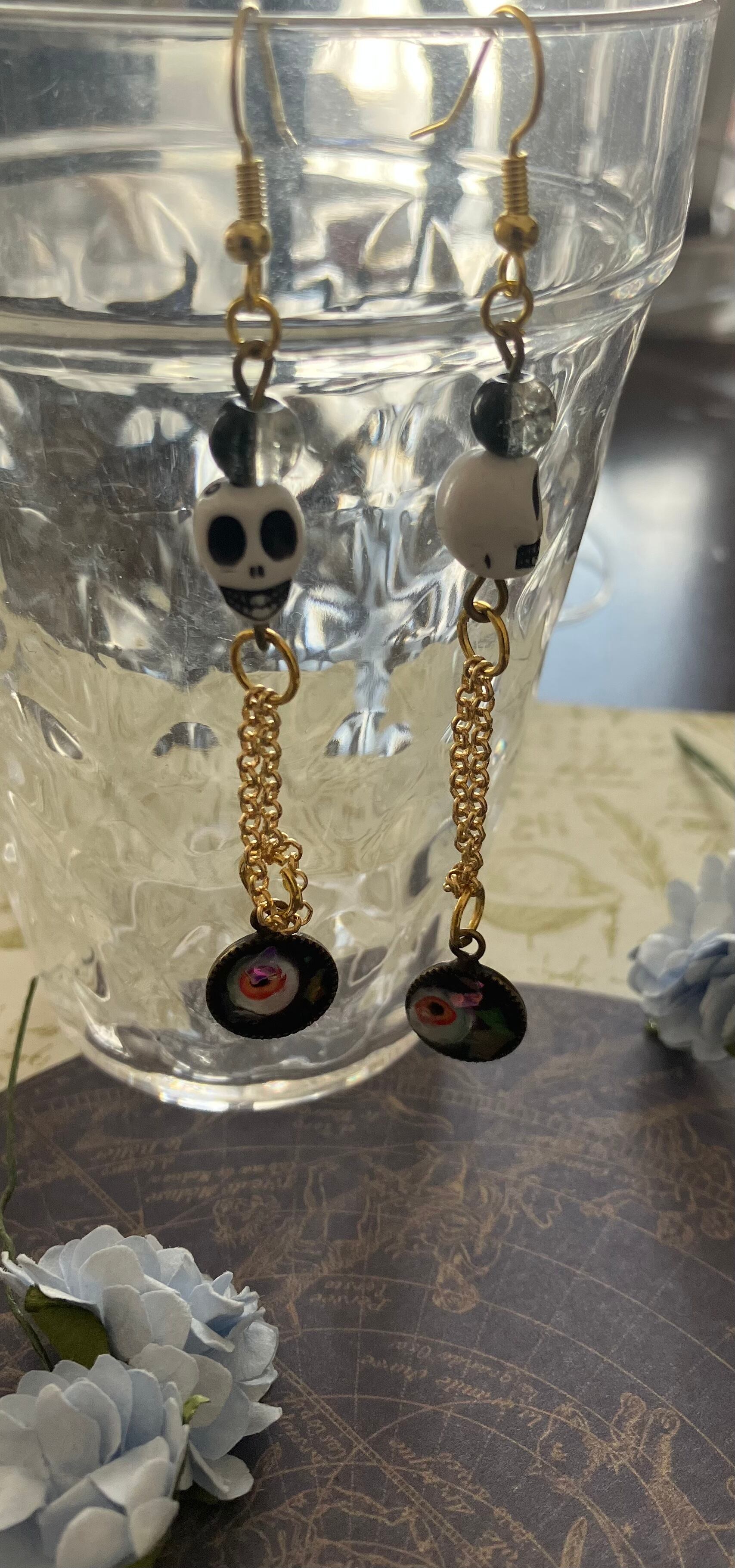 目玉とスカルを使用したシンプルかつ独創的なデザインのピアスです。揺れるチェーンが華やかさを演出します。