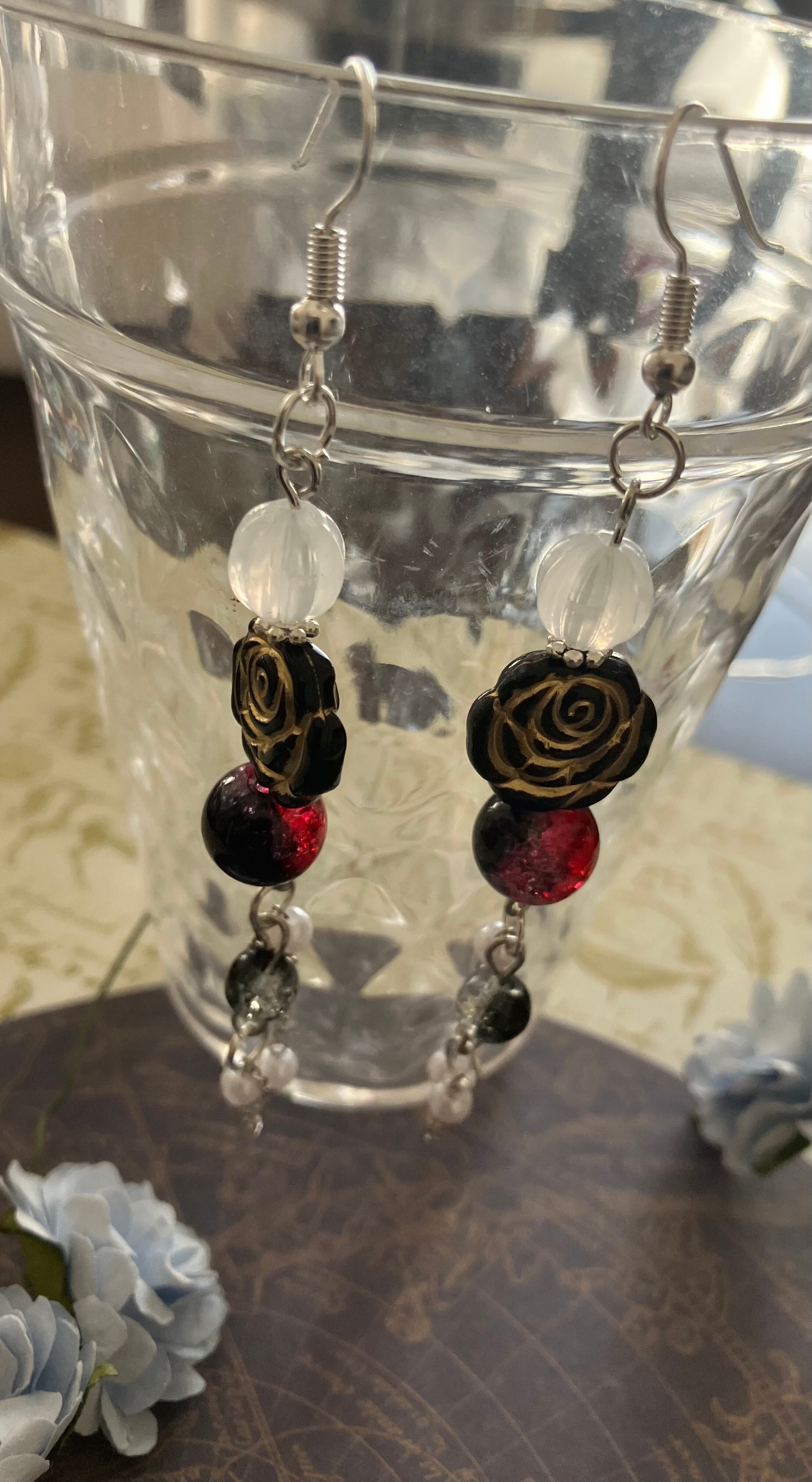 ダークな魅力とロマンティックな雰囲気を演出します。さらに、レッドブラックビーズがピアス全体を彩り、存在感を際立たせます。