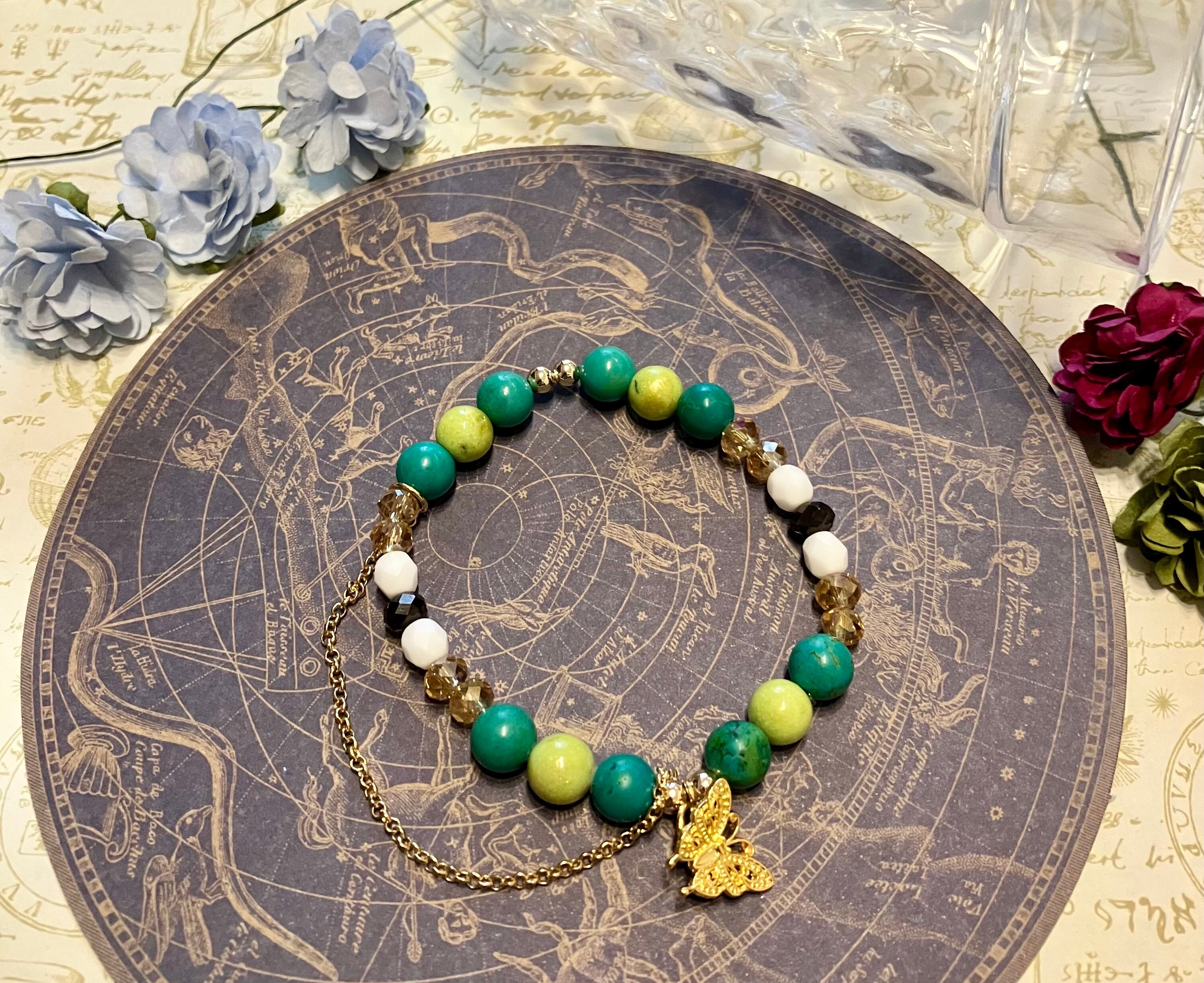 グリーンを貴重とした可愛らしいブレスレットです。ゴールドのバタフライパーツやチェーンが華やかに手元を彩ります。