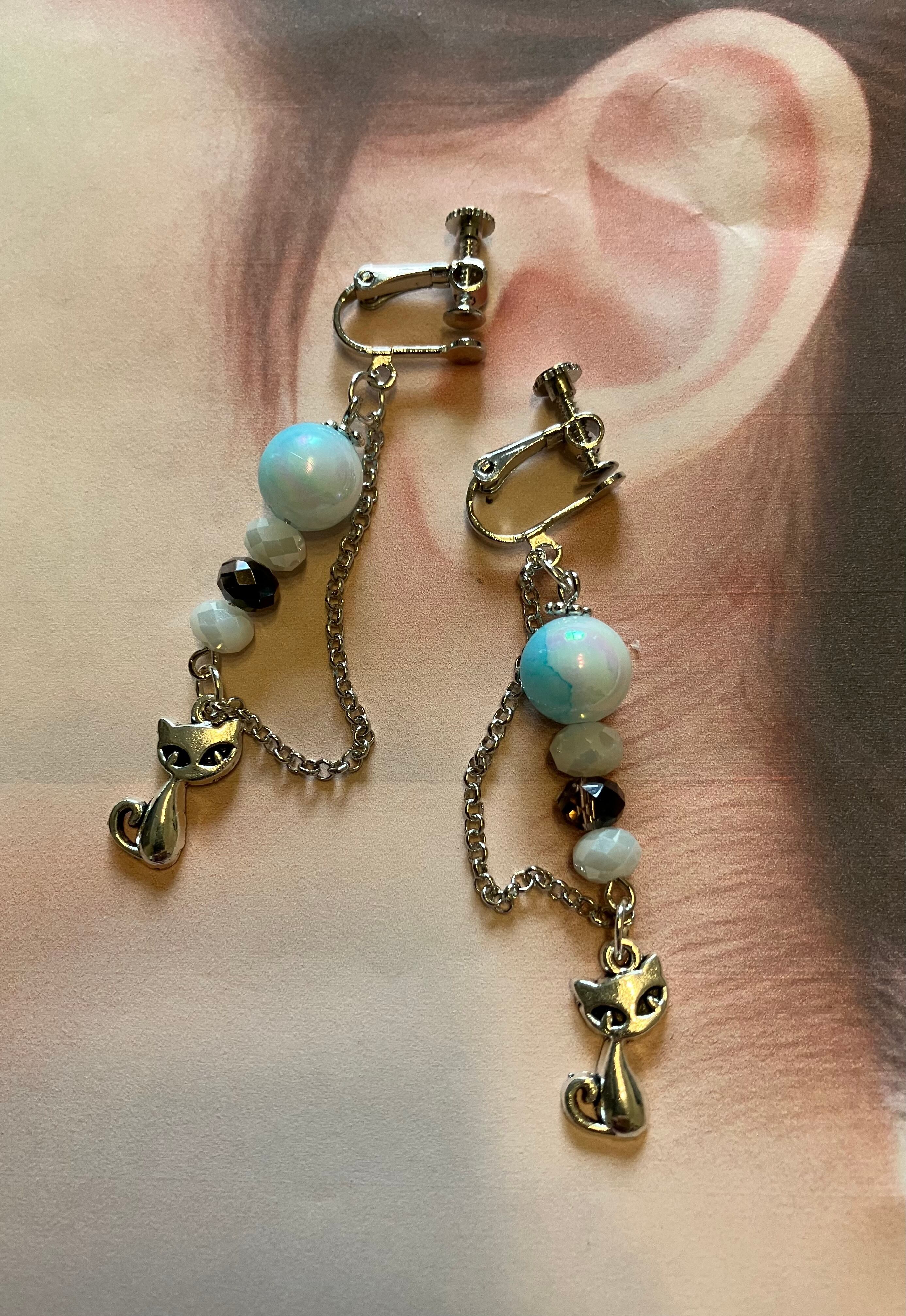 耳元を飾るキャットモチーフが周りの視線を集めること間違いなし。ブルービーズとシルバーチャームが相まって、洋服の色味を選ばずに合わせることができるのも嬉しいポイントです。